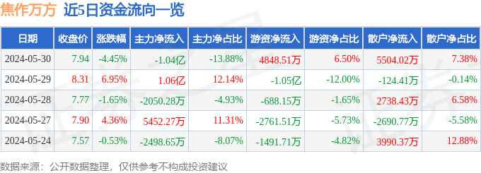 5月30日的资金流向数据方面,主力资金净流出1.04亿元,占总成交额13.88%,游资资金净流入4848.51万元,占总成交额6.5%,散户资金净流入5504.02万元,占总成交额7.38%。