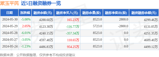 漱玉平民融资融券信息显示,融资方面,当日融资买入895.12万元,融资偿还729.89万元,融资净买入165.23万元。融券方面,融券卖出2800.0股,融券偿还0.0股,融券余量8523.0股,融券余额10.86万元。融资融券余额4299.46万元。近5日融资融券数据一览见下表: