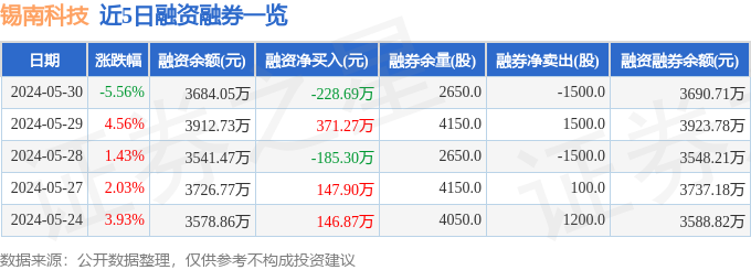 锡南科技融资融券信息显示,融资方面,当日融资买入618.51万元,融资偿还847.2万元,融资净偿还228.69万元。融券方面,融券卖出0.0股,融券偿还1500.0股,融券余量2650.0股,融券余额6.66万元。融资融券余额3690.71万元。近5日融资融券数据一览见下表: