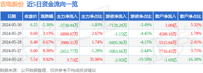 财经消息,截至2024年5月30日收盘,吉电股份(000875)报收于6.25元,下跌5.3%,换手率11.47%,成交量319.92万手,成交额20.43亿元。