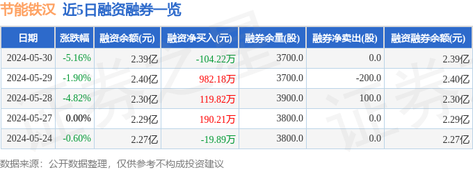 节能铁汉融资融券信息显示,融资方面,当日融资买入1181.46万元,融资偿还1285.68万元,融资净偿还104.22万元。融券方面,融券卖出0.0股,融券偿还0.0股,融券余量3700.0股,融券余额0.54万元。融资融券余额2.39亿元。近5日融资融券数据一览见下表: