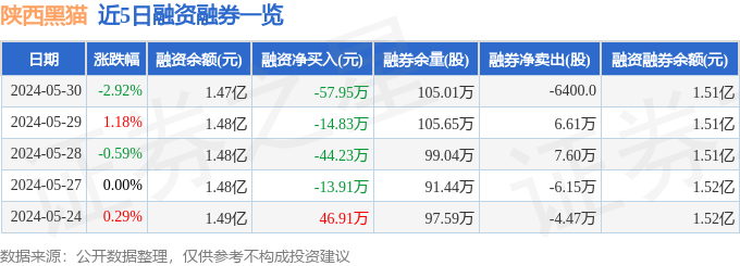 陕西黑猫融资融券信息显示,融资方面,当日融资买入124.49万元,融资偿还182.44万元,融资净偿还57.95万元。融券方面,融券卖出1.21万股,融券偿还1.85万股,融券余量105.01万股,融券余额349.68万元。融资融券余额1.51亿元。近5日融资融券数据一览见下表: