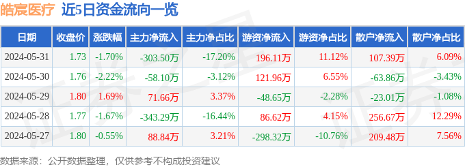 皓宸医疗(002622)5月31日主力资金净卖出303.50万元
