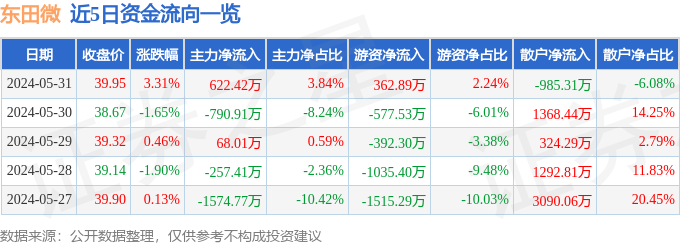 股票行情快报:东田微(301183)5月31日主力资金净买入622.42万元