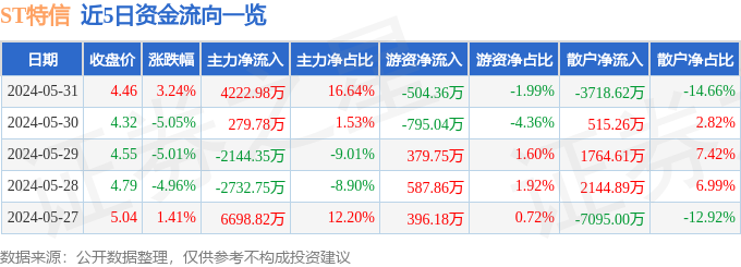 财经消息,截至2024年5月31日收盘,ST特信(000070)报收于4.46元,上涨3.24%,换手率6.37%,成交量56.64万手,成交额2.54亿元。