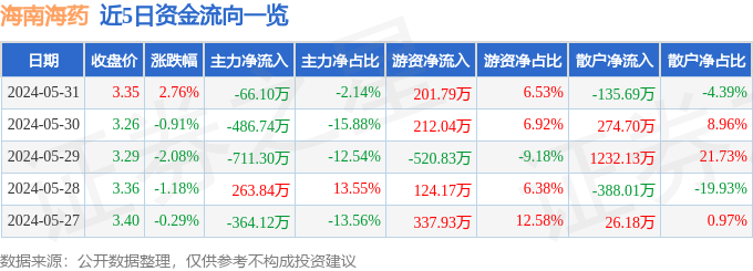 股票行情快报:海南海药(000566)5月31日主力资金净卖出66.10万元