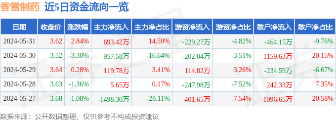 股票行情快报:香雪制药(300147)5月31日主力资金净买入693.42万元