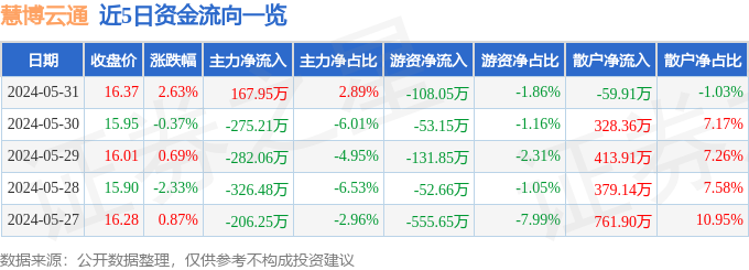 股票行情快报:慧博云通(301316)5月31日主力资金净买入167.95万元