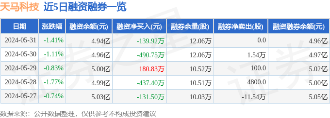 天马科技融资融券信息显示,融资方面,当日融资买入393.13万元,融资偿还533.05万元,融资净偿还139.92万元。融券方面,融券卖出0.0股,融券偿还0.0股,融券余量12.06万股,融券余额168.72万元。融资融券余额4.96亿元。近5日融资融券数据一览见下表: