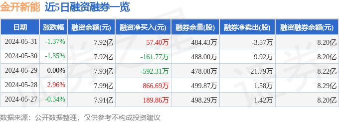 金开新能融资融券信息显示,融资方面,当日融资买入1099.68万元,融资偿还1042.28万元,融资净买入57.4万元。融券方面,融券卖出8.85万股,融券偿还12.42万股,融券余量484.43万股,融券余额2790.32万元。融资融券余额8.2亿元。近5日融资融券数据一览见下表: