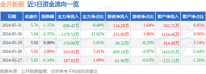 5月31日的资金流向数据方面,主力资金净流出696.42万元,占总成交额8.48%,游资资金净流入134.28万元,占总成交额1.64%,散户资金净流入562.15万元,占总成交额6.85%。