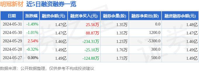 明冠新材融资融券信息显示,融资方面,当日融资买入273.77万元,融资偿还248.21万元,融资净买入25.56万元。融券方面,融券卖出0.0股,融券偿还0.0股,融券余量1.35万股,融券余额17.0万元。融资融券余额1.48亿元。近5日融资融券数据一览见下表: