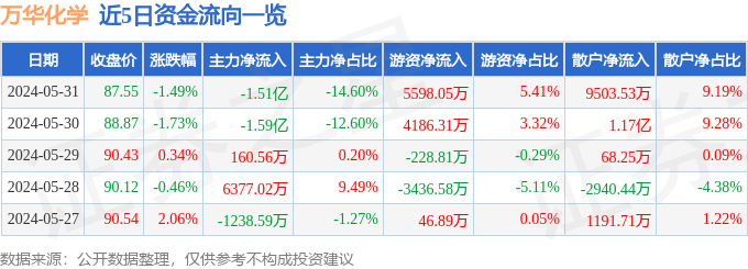 万华化学(600309)5月31日主力资金净卖出1.51亿元