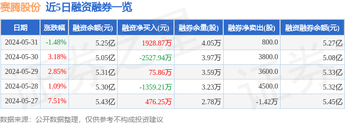 赛腾股份融资融券信息显示,融资方面,当日融资买入5989.31万元,融资偿还4060.43万元,融资净买入1928.87万元。融券方面,融券卖出2400.0股,融券偿还1600.0股,融券余量4.05万股,融券余额283.7万元。融资融券余额5.27亿元。近5日融资融券数据一览见下表: