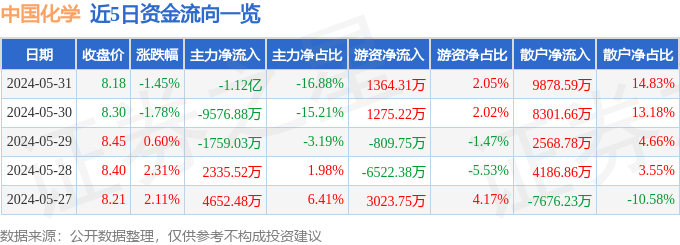 中国化学(601117)5月31日主力资金净卖出1.12亿元