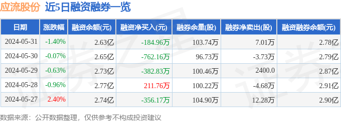 应流股份融资融券信息显示,融资方面,当日融资买入754.93万元,融资偿还939.89万元,融资净偿还184.96万元。融券方面,融券卖出8.78万股,融券偿还1.77万股,融券余量103.74万股,融券余额1461.64万元。融资融券余额2.78亿元。近5日融资融券数据一览见下表: