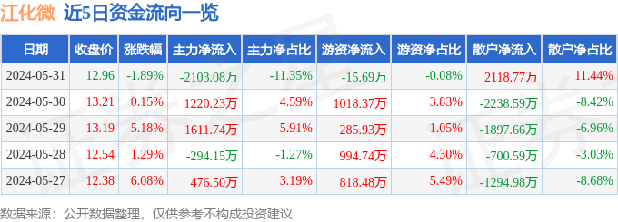 江化微(603078)5月31日主力资金净卖出2103.08万元