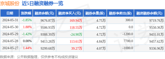 京城股份融资融券信息显示,融资方面,当日融资买入572.5万元,融资偿还402.56万元,融资净买入169.94万元。融券方面,融券卖出300.0股,融券偿还0.0股,融券余量4.75万股,融券余额42.89万元。融资融券余额9719.76万元。近5日融资融券数据一览见下表: