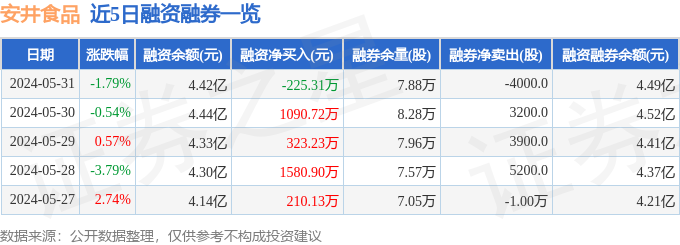 安井食品融资融券信息显示,融资方面,当日融资买入2133.22万元,融资偿还2358.54万元,融资净偿还225.31万元。融券方面,融券卖出3500.0股,融券偿还7500.0股,融券余量7.88万股,融券余额718.18万元。融资融券余额4.49亿元。近5日融资融券数据一览见下表: