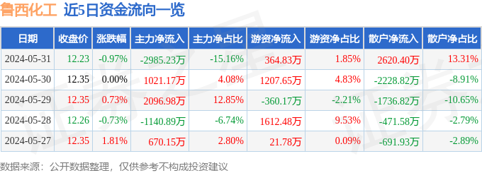 财经消息,截至2024年5月31日收盘,鲁西化工(000830)报收于12.23元,下跌0.97%,换手率0.84%,成交量16.04万手,成交额1.97亿元。