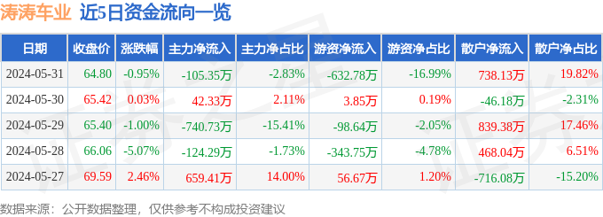 股票行情快报:涛涛车业(301345)5月31日主力资金净卖出105.35万元