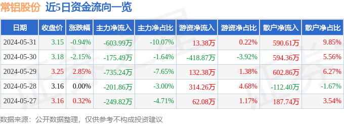 股票行情快报:常铝股份(002160)5月31日主力资金净卖出603.99万元