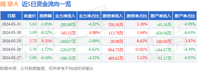 股票行情快报:南玻A(000012)5月31日主力资金净卖出285.00万元