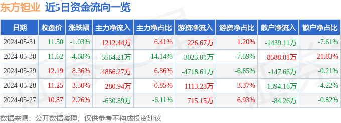 财经消息,截至2024年5月31日收盘,东方钽业(000962)报收于11.5元,下跌1.03%,换手率3.3%,成交量16.35万手,成交额1.89亿元。