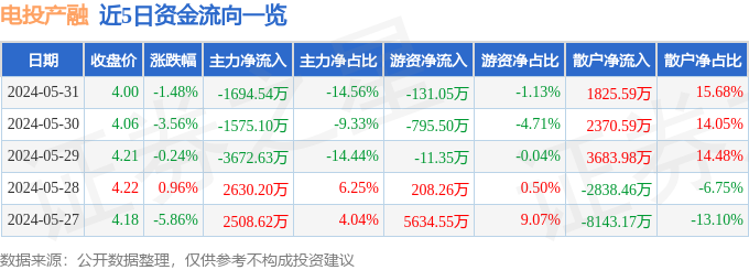 股票行情快报:电投产融(000958)5月31日主力资金净卖出1694.54万元