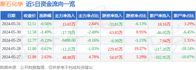 股票行情快报:聚石化学(688669)5月31日主力资金净买入15.65万元