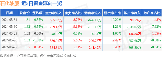 股票行情快报:石化油服(600871)5月31日主力资金净买入535.53万元