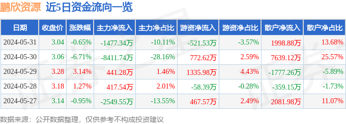 股票行情快报:鹏欣资源(600490)5月31日主力资金净卖出1477.34万元