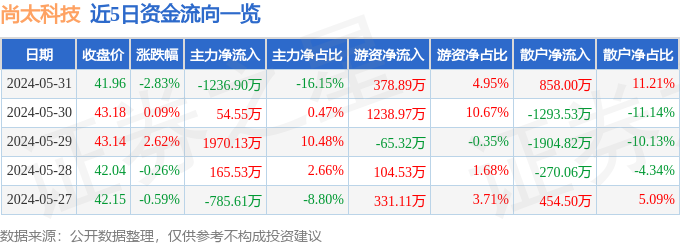 财经消息,截至2024年5月31日收盘,尚太科技(001301)报收于41.96元,下跌2.83%,换手率1.13%,成交量1.81万手,成交额7657.06万元。