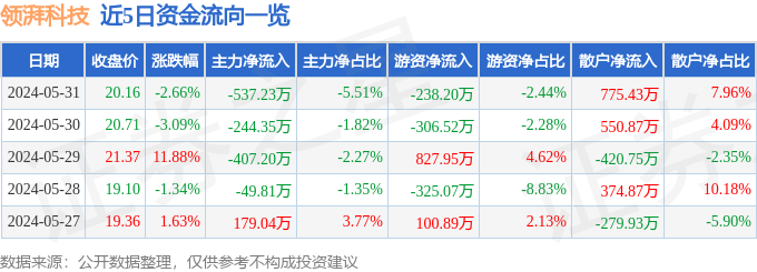领湃科技(300530)5月31日主力资金净卖出537.23万元