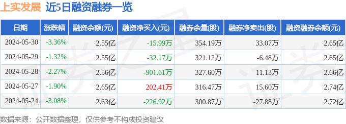 上实发展融资融券信息显示,融资方面,当日融资买入621.67万元,融资偿还637.66万元,融资净偿还15.99万元。融券方面,融券卖出52.0万股,融券偿还18.93万股,融券余量354.19万股,融券余额1020.07万元。融资融券余额2.65亿元。近5日融资融券数据一览见下表: