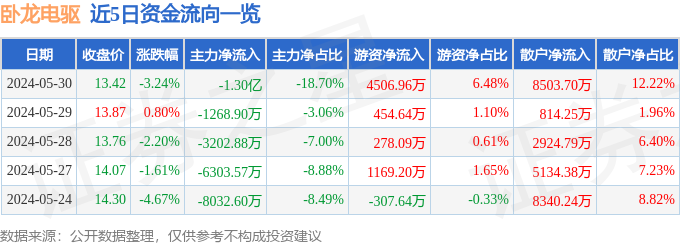 卧龙电驱(600580)5月30日主力资金净卖出1.30亿元