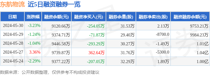 东航物流融资融券信息显示,融资方面,当日融资买入506.33万元,融资偿还760.38万元,融资净偿还254.05万元。融券方面,融券卖出4.08万股,融券偿还1.95万股,融券余量31.53万股,融券余额632.55万元。融资融券余额9753.21万元。近5日融资融券数据一览见下表: