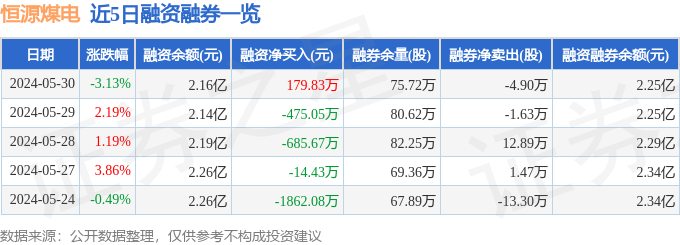 恒源煤电融资融券信息显示,融资方面,当日融资买入994.64万元,融资偿还814.81万元,融资净买入179.83万元。融券方面,融券卖出9900.0股,融券偿还5.89万股,融券余量75.72万股,融券余额959.36万元。融资融券余额2.25亿元。近5日融资融券数据一览见下表: