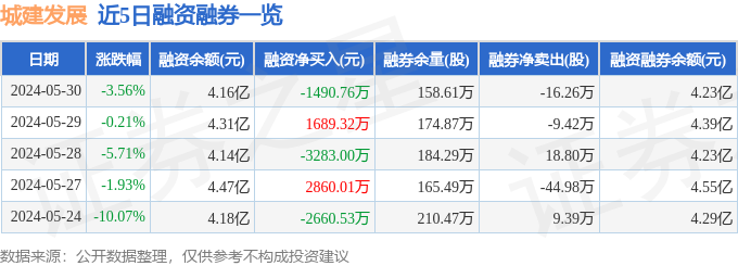 城建发展融资融券信息显示,融资方面,当日融资买入3602.91万元,融资偿还5093.67万元,融资净偿还1490.76万元。融券方面,融券卖出26.33万股,融券偿还42.59万股,融券余量158.61万股,融券余额731.17万元。融资融券余额4.23亿元。近5日融资融券数据一览见下表: