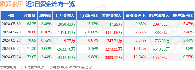 欧派家居(603833)5月30日主力资金净卖出2050.43万元