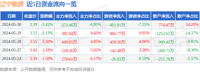 辽宁能源(600758)5月30日主力资金净卖出373.46万元