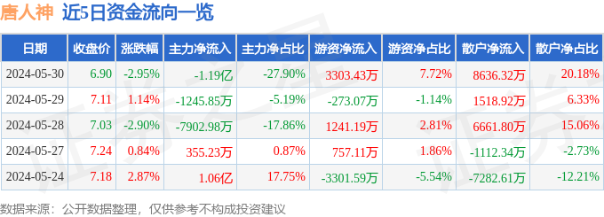 财经消息,截至2024年5月30日收盘,唐人神(002567)报收于6.9元,下跌2.95%,换手率4.37%,成交量61.66万手,成交额4.28亿元。