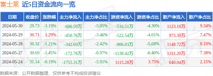 股票行情快报:富士莱(301258)5月30日主力资金净卖出606.59万元
