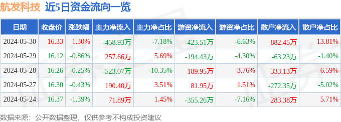 5月30日的资金流向数据方面,主力资金净流出458.93万元,占总成交额7.18%,游资资金净流出423.51万元,占总成交额6.63%,散户资金净流入882.45万元,占总成交额13.81%。