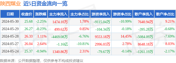 股票行情快报:陕西煤业(601225)5月30日主力资金净买入1474.10万元