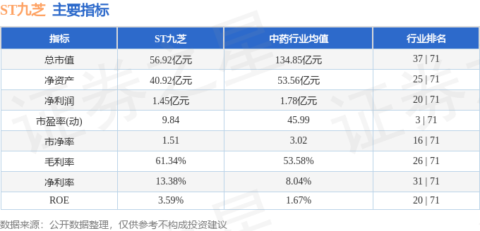 ST九芝2024年一季报显示,公司主营收入10.79亿元,同比下降0.89%;归母净利润1.45亿元,同比下降10.66%;扣非净利润1.39亿元,同比下降13.0%;负债率28.59%,投资收益1202.43万元,财务费用-149.98万元,毛利率61.34%。ST九芝(000989)主营业务:生产、销售药品,销售医疗器械、副食品,;销售政策允许的化学试剂;提供产品包装印刷及医药技术咨询服务;提供健康咨询服务;医药科技开发;医药产业投资。