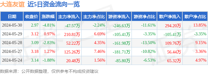 大连友谊(000679)5月30日主力资金净卖出47.57万元