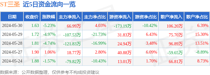 财经消息,截至2024年5月30日收盘,ST三圣(002742)报收于1.63元,下跌5.23%,换手率2.36%,成交量10.18万手,成交额1661.37万元。