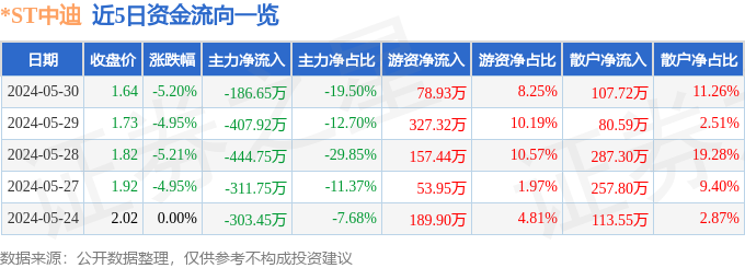 *ST中迪(000609)5月30日主力资金净卖出186.65万元