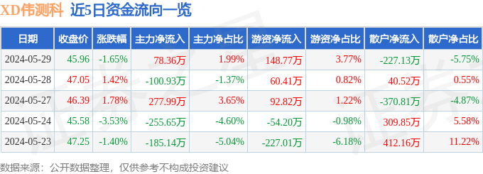 XD伟测科(688372)5月29日主力资金净买入78.36万元